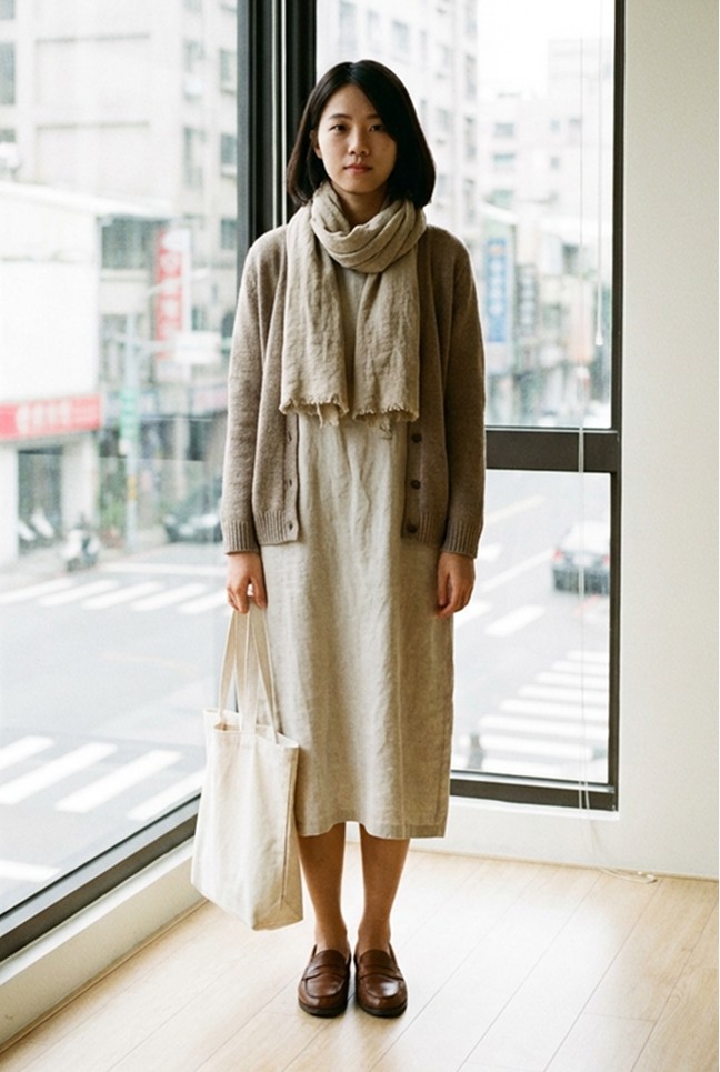 穿上您要賣的服飾(包含上身下身與配件)拍一張全身照,此種照片可以幫助AI理解衣服的版型、長度、透膚程度,生成的結果最準確。如對準確度沒有高要求上傳平鋪在地板的服裝照也可以。照片要平視、不遮擋細節,下圖為範例: